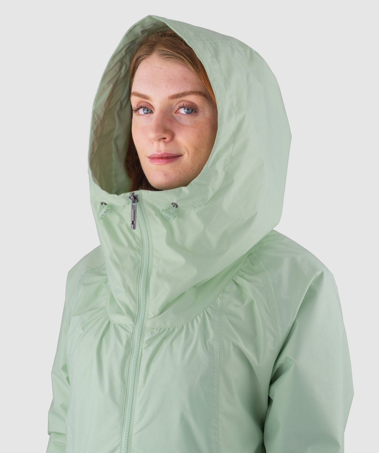 - priestranná nastaviteľná kapucňa s riasením v prednej časti