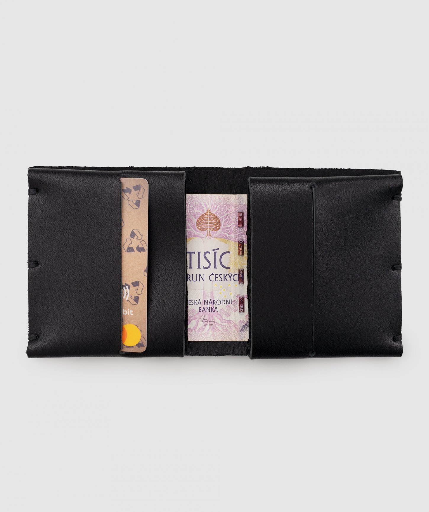 Prírodná hovädzia koža s hrúbkou 2 mm, dva vnútorné sloty na karty, dve vnútorné vrecká, slot na uloženie bankoviek. Rozmery: 9,5 × 9,5 cm. Vyrobené v ručnej kožodielni v Jeseníkoch.